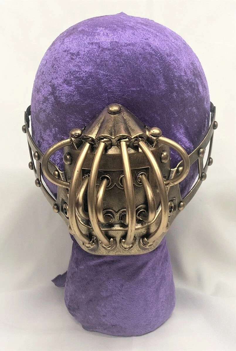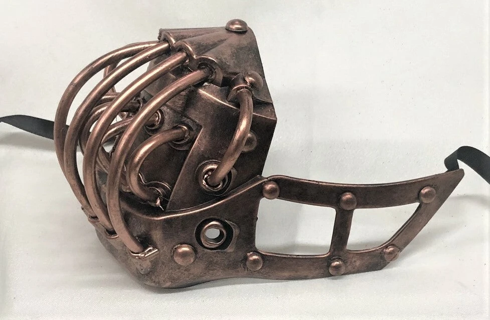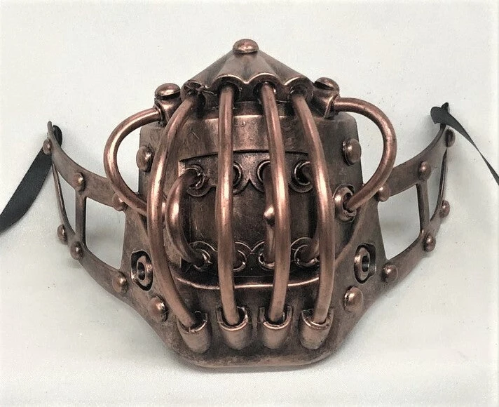 Mask features metallic distressed base with bronze tubing and rivet accents.