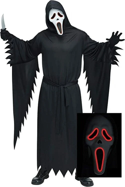 Includes: Hooded Robe, Belt, Light-up E.L. Ghost Face Mask and Battery Box(Batteries not included). (2-AA batteries Required).