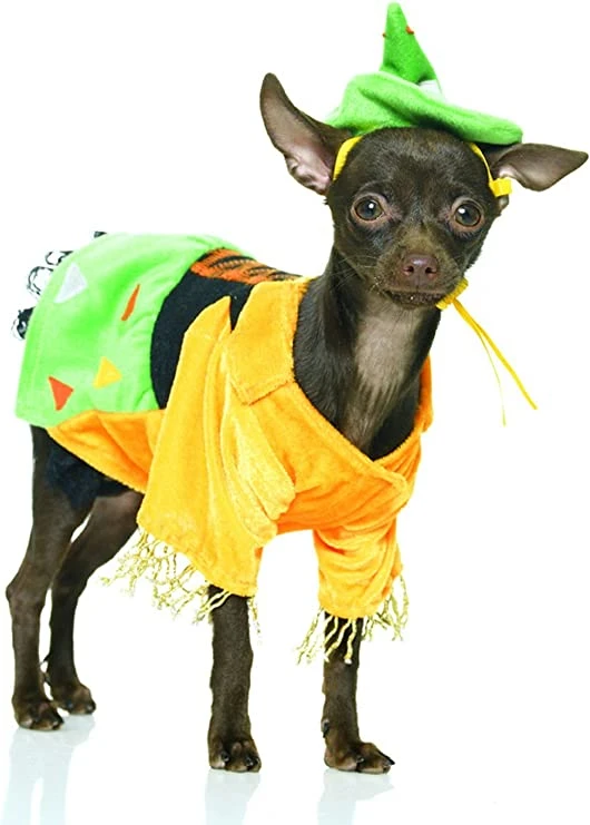 Dress your pup up in this adorable fuzzy scarecrow costume! Includes dress and hat with both lace and metallic trim.