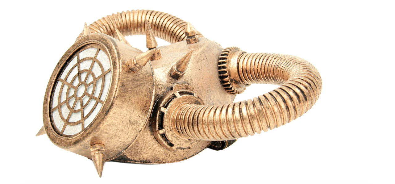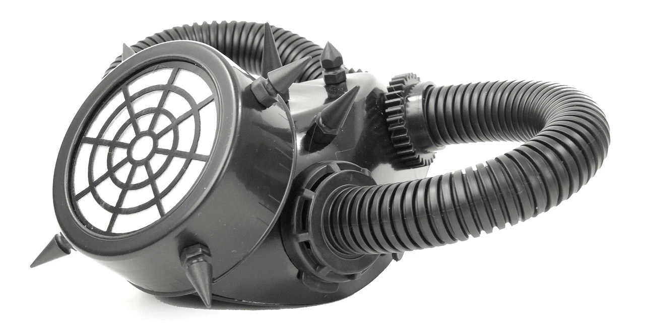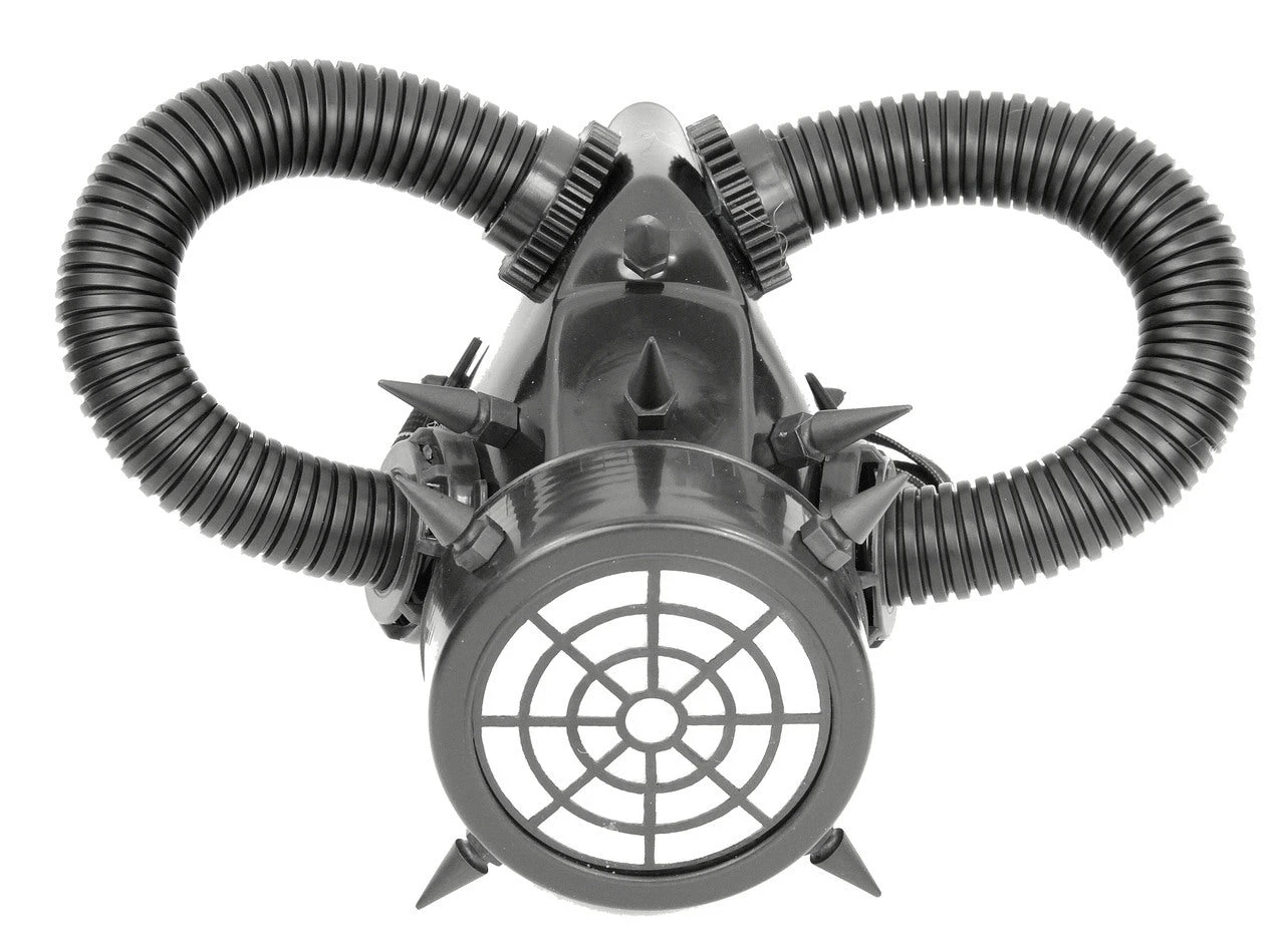 Mask features a steampunk inspired distressed base, spikes, tubes and filter.Â